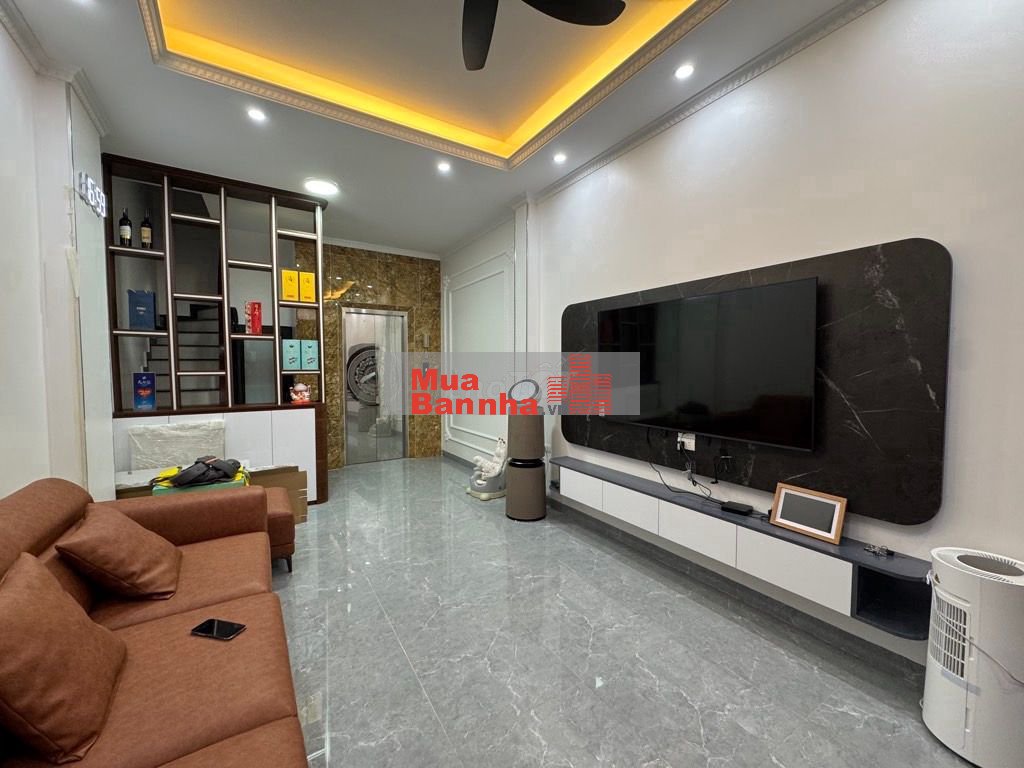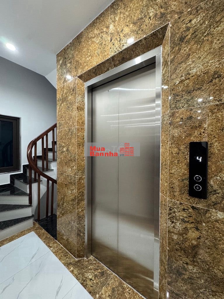 Phòng khách gọn gàng, bộ sofa tông nâu trầm hài hòa với kệ trang trí thiết kế tinh tế, từng đường nét đều vuông vức, chắc chắn. Cửa kính lớn giúp không khí đối lưu, đón sáng tự nhiên, mang lại cảm giác mát mẻ và dễ chịu. Ngay cả khu vực cầu thang và thang máy cũng được ốp đá cẩn thận, tạo điểm nhấn sang trọng mà vẫn bền bỉ theo thời gian.
