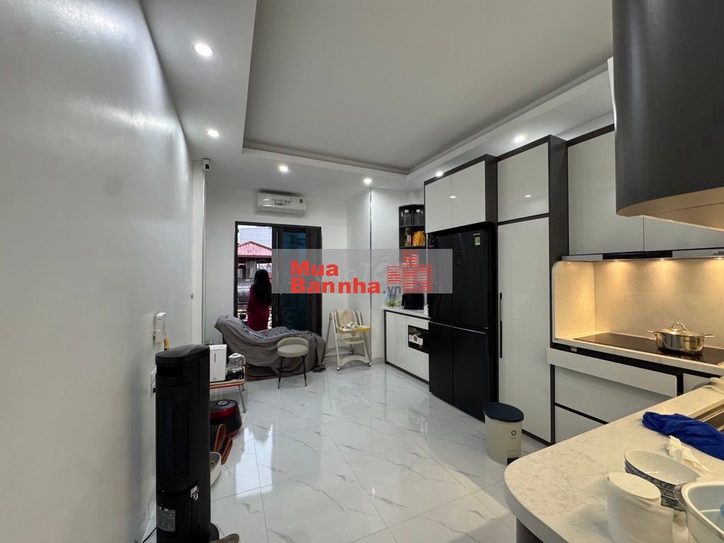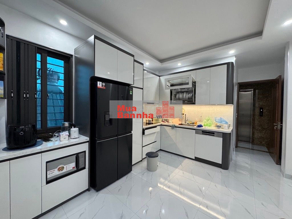 Phòng bếp thực sự là điểm cộng lớn. Hệ tủ bếp hiện đại, phối hai tông trắng – ghi thanh lịch, cánh tủ phẳng mịn, bố trí khoa học tối ưu công năng. Mặt đá sáng màu sạch sẽ, thiết bị âm tủ gọn gàng, mọi thứ đều được sắp xếp ngăn nắp. Ánh sáng hắt dưới tủ vừa đủ ấm, tạo cảm giác bếp luôn sạch, khô ráo và ấm cúng.