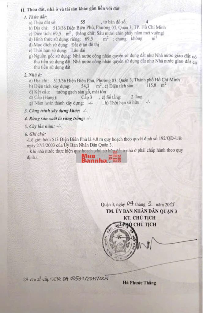 Quý vị đang xem nội dung tin rao "BÁN NHÀ ĐIỆN BIÊN PHỦ Q.3 - NỞ HẬU 8,4M X 12M -DTCN 70M2, DT SÀN 116M2". Mọi thông tin, nội dung liên quan tới tin rao này là do người đăng tin đăng tải và chịu trách nhiệm. Muabannha.vn luôn cố gắng để các thông tin được hữu ích nhất cho quý vị tuy nhiên Muabannha.vn không đảm bảo và không chịu trách nhiệm về bất kỳ thông tin, nội dung nào liên quan tới tin rao này.