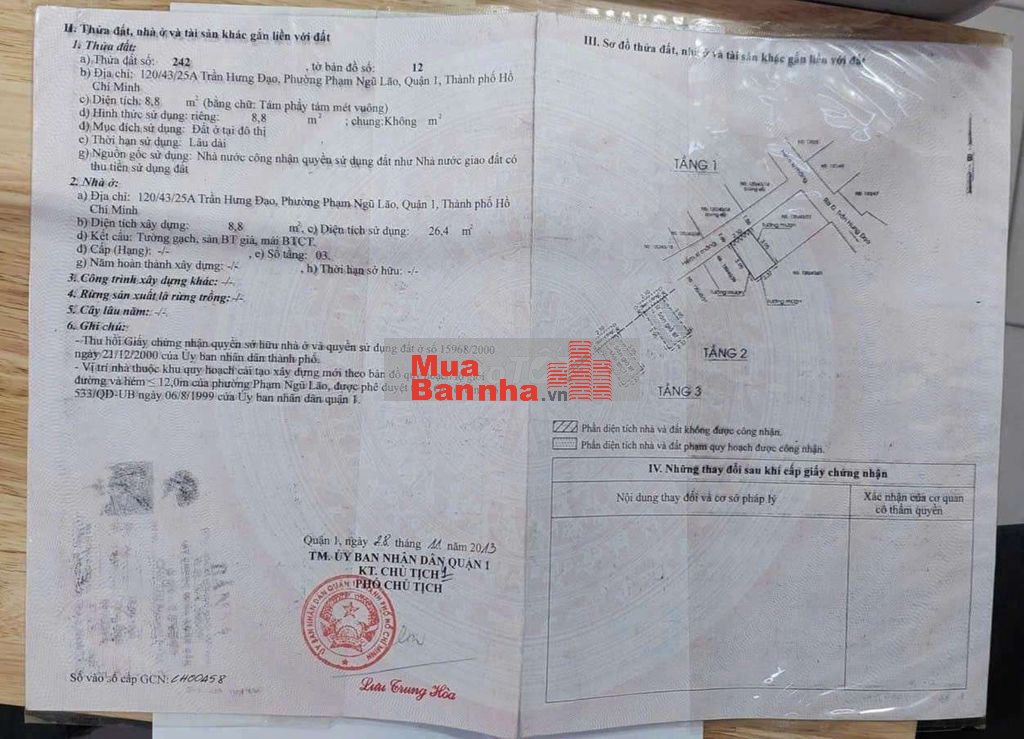 Gửi hoa Hồng 1% nhờ dv dẫn dùm Nhà 3 lầu sổ riêng Quận 1 sát Bùi Viện