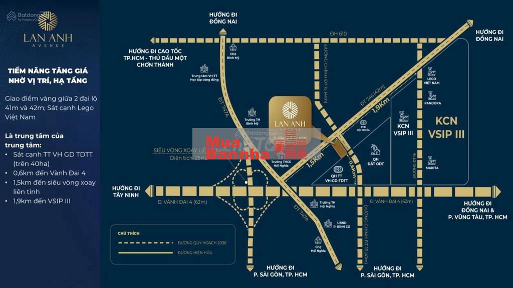 Nằm tại phường Bình Cơ, TP. Tân Uyên, Bình Dương, Lan Anh Avenue sở hữu vị trí đắt giá giữa 2 trục đường lớn ĐT 746B (42 m) và ĐT 15 (41 m).
