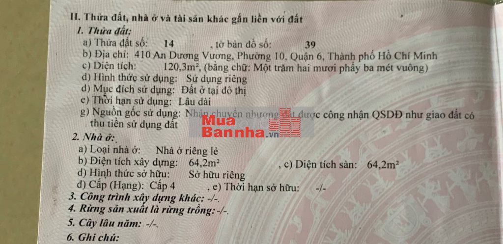 Quý vị đang xem nội dung tin rao "Hoa hồng 2% - 18.15 tỷ - mặt tiền 410 An Dương Vương P10, Q6 - 127m²". Mọi thông tin, nội dung liên quan tới tin rao này là do người đăng tin đăng tải và chịu trách nhiệm. Muabannha.vn luôn cố gắng để các thông tin được hữu ích nhất cho quý vị tuy nhiên Muabannha.vn không đảm bảo và không chịu trách nhiệm về bất kỳ thông tin, nội dung nào liên quan tới tin rao này.