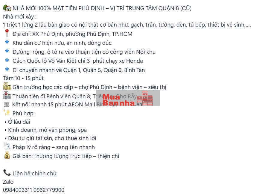 Quý vị đang xem nội dung tin rao "BÁN NHÀ Ở MẶT TIỀN ĐƯỜNG PHÚ ĐỊNH NEW 100%". Mọi thông tin, nội dung liên quan tới tin rao này là do người đăng tin đăng tải và chịu trách nhiệm. Muabannha.vn luôn cố gắng để các thông tin được hữu ích nhất cho quý vị tuy nhiên Muabannha.vn không đảm bảo và không chịu trách nhiệm về bất kỳ thông tin, nội dung nào liên quan tới tin rao này.