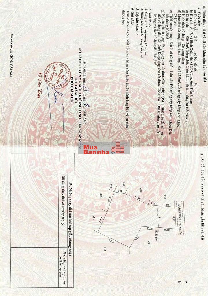 - Tổng diện tích: 908,3 m2. Trong đó 124m2 đất ở nông thôn, đất trồng cây hàng năm 784,3m2