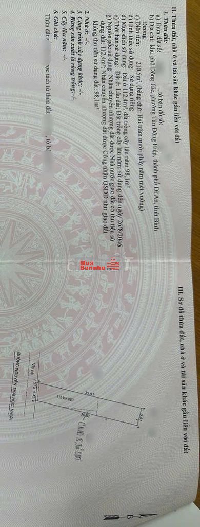 - Diện tích 210,5m ngang 6m thổ cư 121,3m
