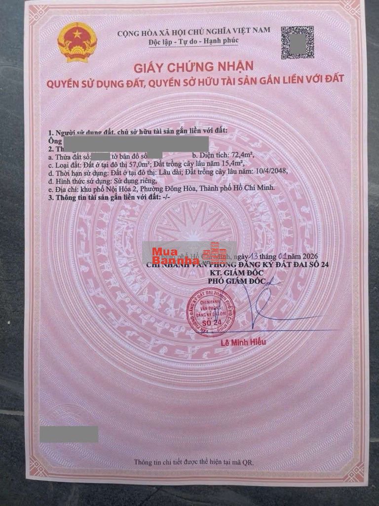 Thổ cư 57m2. Sổ hồng riêng.