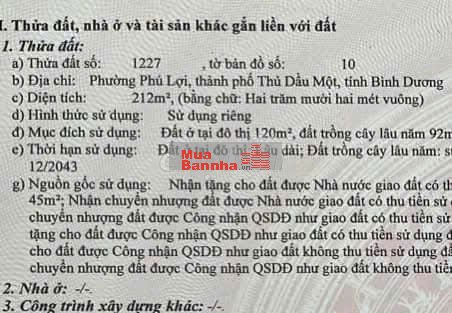Quý vị đang xem nội dung tin rao "Nhà Phú Lợi,Thủ Dầu Một 212m2 giá 1ty350 120m2 thổ cư, sổ hồng riêng". Mọi thông tin, nội dung liên quan tới tin rao này là do người đăng tin đăng tải và chịu trách nhiệm. Muabannha.vn luôn cố gắng để các thông tin được hữu ích nhất cho quý vị tuy nhiên Muabannha.vn không đảm bảo và không chịu trách nhiệm về bất kỳ thông tin, nội dung nào liên quan tới tin rao này.
