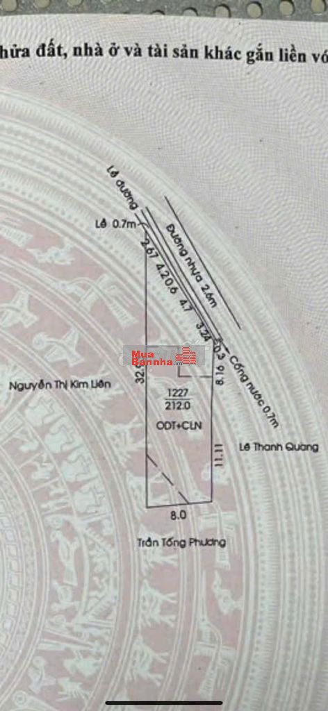 • Tổng diện tích đất: 212m². Thổ cư: 120m².