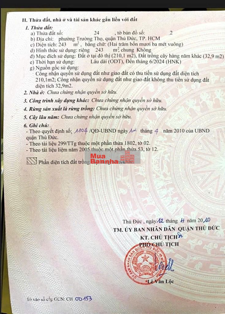 - Diện tích đất: Công nhận 243m² thổ cư 210m².