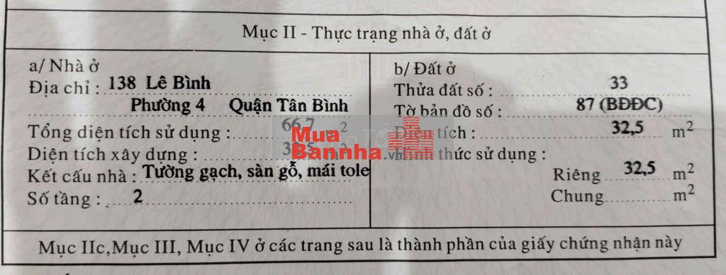 chính chủ. 138 lê bình, p4 tân bình (p tân sơn nhất). tiện kinh doanh. hoa hồng môi giới. mặt tiền đường lớn 2 xe tải. ko tiếp môi giới đăng bán nhà chỉ tiếp môi giới bán nhà. gọi điện ko được thì nhắn sms