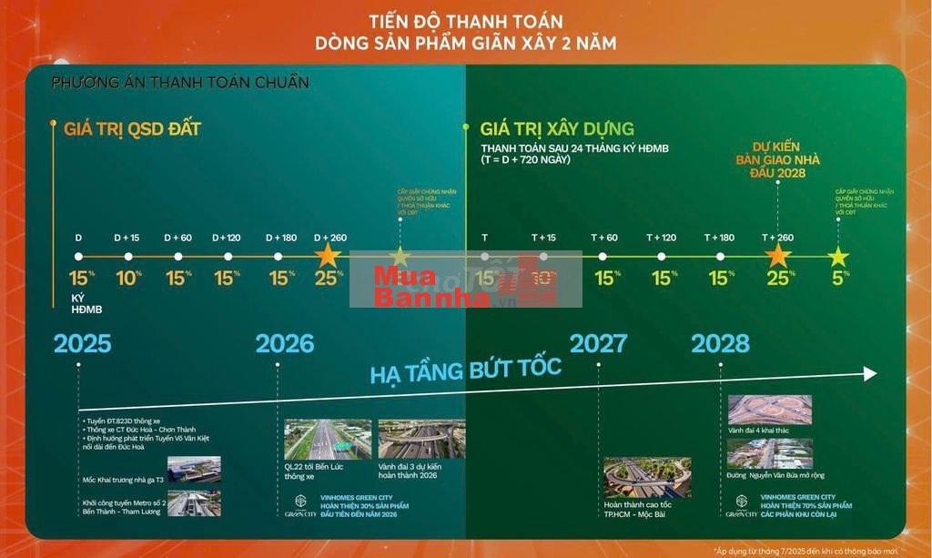 Căn nhà thanh toán theo tiến độ 15 đợt mỗi đợt từ 5-10% đến tháng 6/2028 nhẹ hàng dòng tiền, tăng giá trị theo sự phát triển của hạ tầng khu vực như vành đai 3, Quốc lộ 823D, đường Võ Văn Kiệt kéo dài.