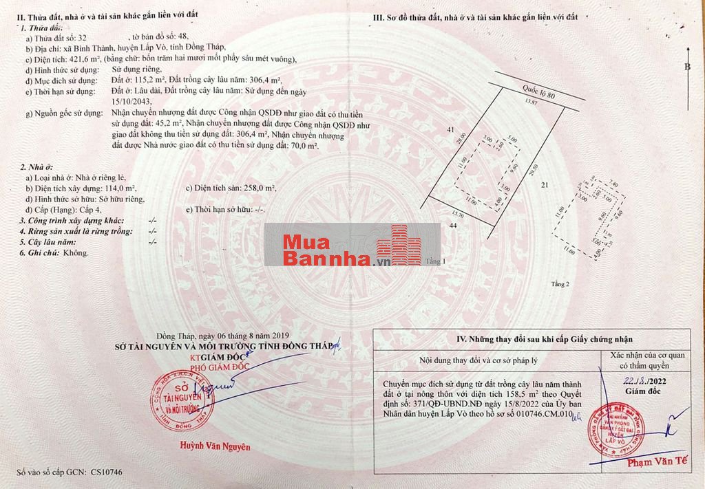 + DT đất: 421,6m2, trong đó: đất ở: 115,2m2 (lâu dài); đất CLN: 306,4m2. Có Biệt thự 1 trệt 2 Lầu. DTXD: 114m2; Tổng DT sàn: 258m2.