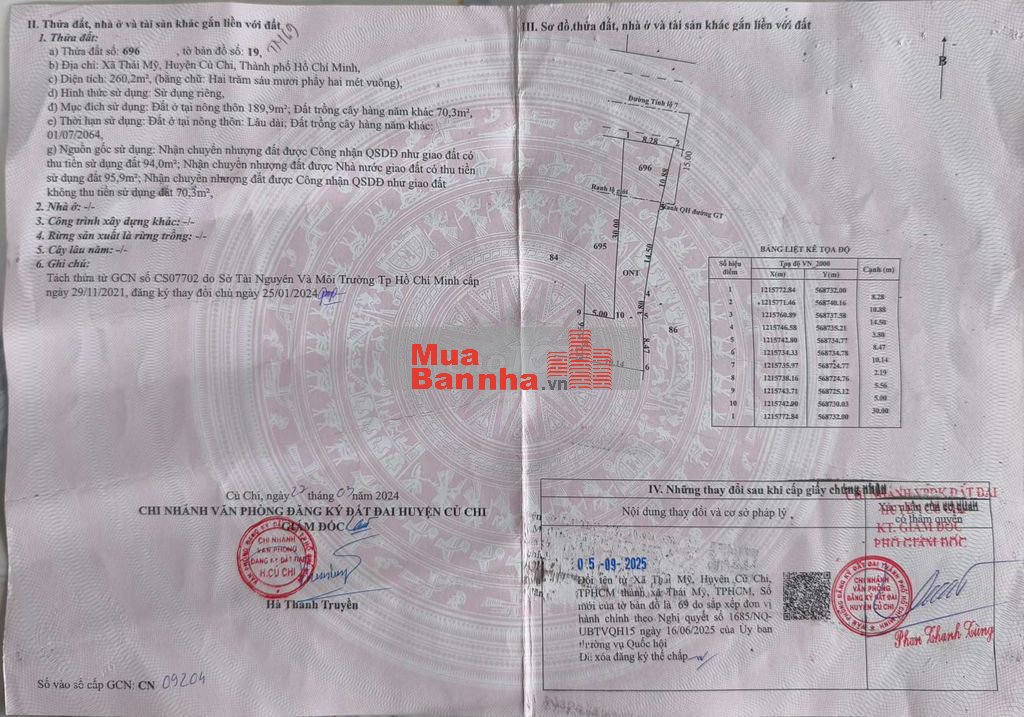 Cần bán nhà mặt tiền đường tỉnh lộ 7,xã Thái Mỹ, huyện Củ Chi, tổng diện tích 260m2, thổ cư 190m2, ngang 8,3m, dài 38m, đuôi đất bọc chữ L 10m.